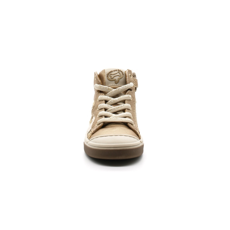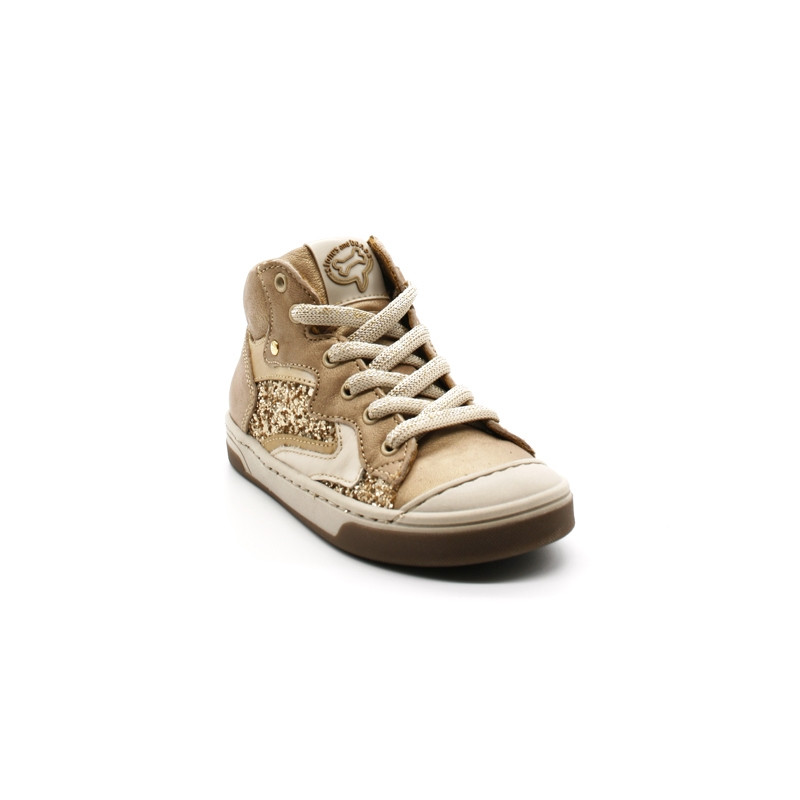 Chaussures montantes pour filles. Tige en cuir Or ou Violet.. Tirette arrière. Col et languette matelassés. Flans pailletés. Bout renforcé. Logo Stones and Bones cousu sur la languette. Ajustement par lacets. Zip intérieur. Doublure cuir. Semelle intérieure amovible en cuir et latex. Semelle extérieure en caoutchouc.